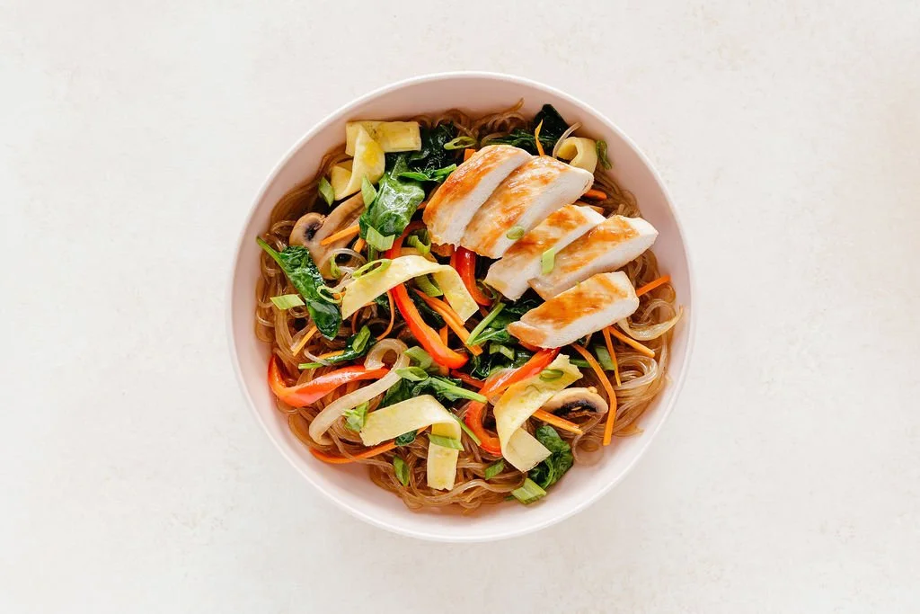 It’s definitely hard to pick one favorite because I love so many of the meals on our menu. But if I had to say, I’m partial to our Japchae. It’s a Korean dish that’s served at celebrations and is a real crowd-pleaser. It’s made with sweet potato glass noodles that are naturally gluten-free and are more nutrient-dense than your standard white flour noodle. Many different vegetables are carefully seasoned and stir-fried in a slightly sweet sauce, including spinach, onion, red bell peppers, carrots, and mushrooms, then topped with strips of cooked egg and scallions. Our version of the dish uses coconut aminos so it’s soy-free. My mom made this dish for just about every party she hosted or potluck she attended, and it’s not only delicious and nutritious, it brings up beloved memories of time spent together over food that celebrates our culture.