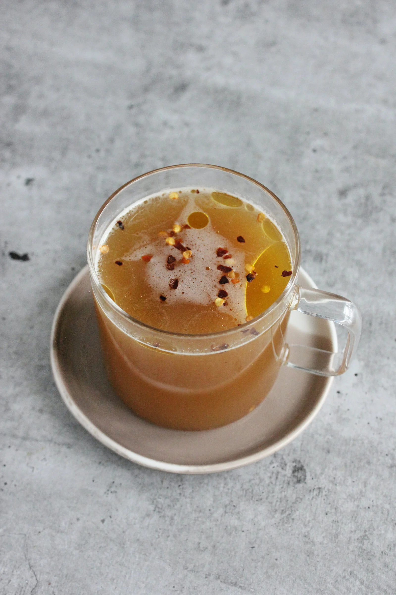 I love adding a poached egg, spinach, and a splash of Provenance's Chile de Arbol Paste, also from the Wellness Shop. To keep up my immunity and as a simple warming snack during colder months, I like to sip it warmed in a mug with a drizzle of olive oil, sprinkle of sea salt, and a pinch of crushed chili flakes.